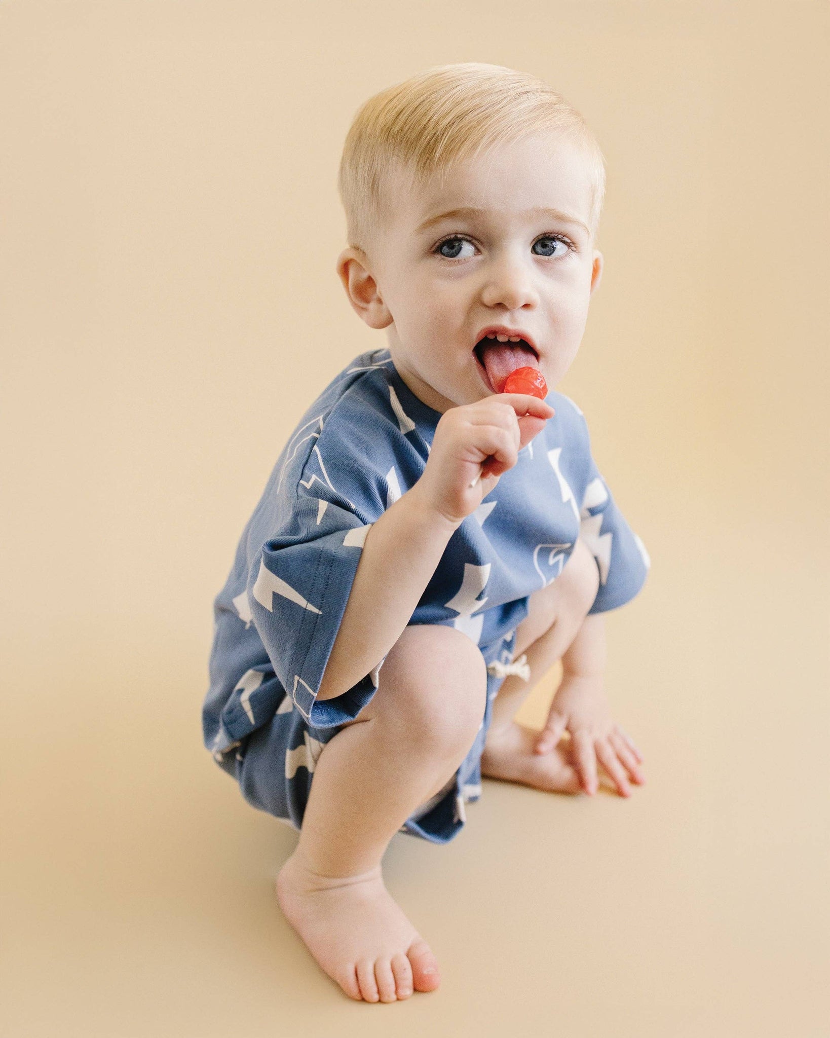 Light up their look with our Blue Bolts shorts set! Featuring a vibrant blue background with bold white lightning bolts, this set is perfect for little ones who love a fun, energetic design. Soft, comfortable, and made for active play, this set is perfect for any adventure.